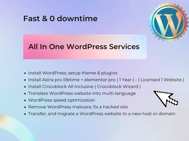 We can install WordPress and set up any free or premium theme; install Astra Pro + Elementor Pro; install Crocoblock or Astra Agency; translate WordPress websites into multiple languages; optimize WordPress speed; remove WordPress malware; fix a hacked site; WordPress Site Migration + Security + Updates + Backups + Premium Firewall; and much more.